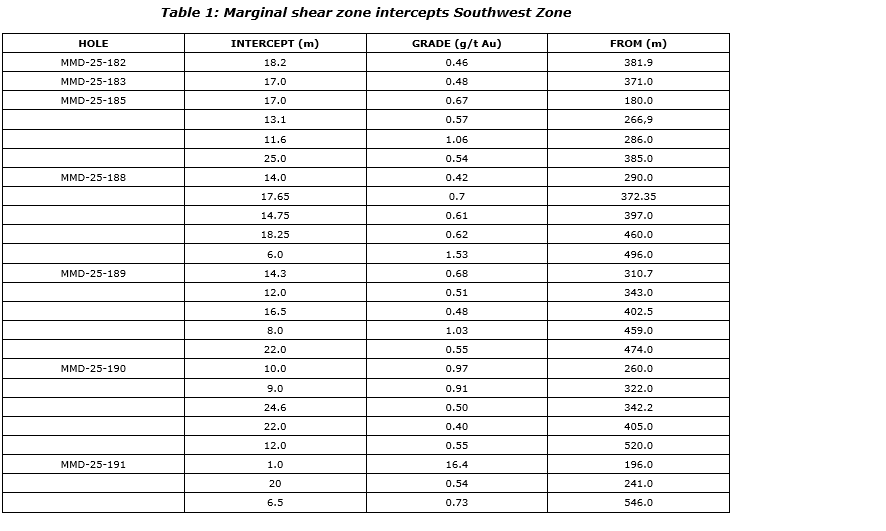 Holes MMD-25-183, MMD-25-185, MMD-25-188 and MMD-25-189 were drilled on the western side of the Southwest zone and all collared into the northern dacite volcanic package consisting of silica-sericite altered brecciated dacite volcanics with localized metre scaled diorite dikes increasing with frequency at depth. All holes transitioned into the primary Southwest zone diorite complex of sericite-silica-hematite altered diorites and granodiorites with locally moderately to strongly shears bearing 3 to 5 per cent pyrite-chalcopyrite. These sheared sections returned low-grade to high-grade mineralized intercepts, such as: 17.0 m of 0.48 g/t Au from 371.0 m and 12.3 m of 1.11 g/t Au from 556 m, including 6.3 m of 1.94 g/t Au from 562 m, in MMD-25-183; 17.0 m of 0.67 g/t Au from 180 m, including 3.0 m of 1.67 g/t Au from 183 m, 11.6 m of 1.06 g/t Au from 286 m and 10.0 m of 2.76 g/t Au from 314 m, including 5.0 m of 5.06 g/t Au from 314 m, in MMD-25-185; 17.65 m of 0.70 g/t Au from 372.35 m and 18.25 m of 0.62 g/t Au from 460.0 m in MMD-25-188; and 14.3 m of 0.68 g/t Au from 310.7 m, including 4.25 m of 1.67 g/t Au from 314.0 m, 22.0 m of 0.55 g/t Au from 474.0 m, including 3.0 m of 1.68 g/t Au from 474.0 m, in MMD-25-189.