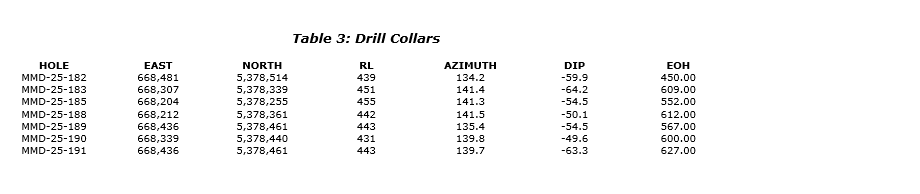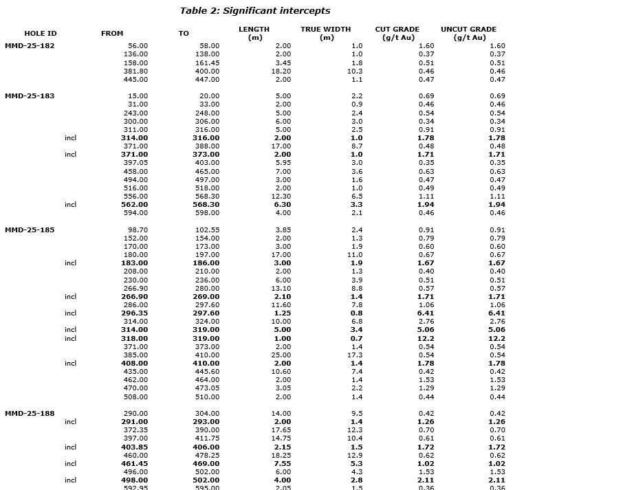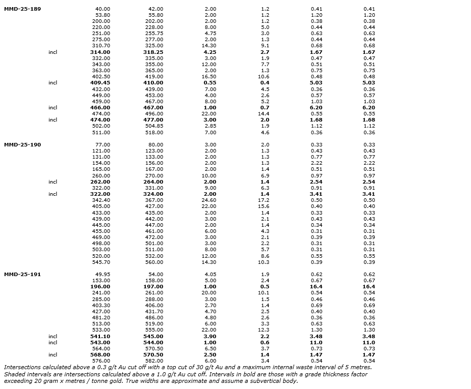 Holes MMD-25-182, MMD-25-190 and MMD-25-191 were drilled on the eastern side of the Southwest zone and collared into a generally undeformed porphyritic diorite before transitioning into an alternating sequence of sericite-chlorite altered brecciated dacitic volcanics and weakly mineralized hematite-sericite-silica altered diorite dikes. All three holes intersected the primary diorite complex of the Southwest zone toward the end of the holes encountering sheared sericite-silica-hematite altered diorites and granodiorites with 2 to 3 per cent pyrite-chalcopyrite. MMD-25-182 was terminated early into the diorite complex, as it had already intersected its primary target. The mineralized diorites returned wide intercepts of moderate to high grades, including: 18.2 m of 0.46 g/t Au from 381.8 m in MMD-25-182; 10.0 m of 0.97 g/t Au from 260.0 m, including 2.0 m of 2.54 g/t Au from 262.0 m and 24.6 m of 0.50 g/t Au from 342.4 m, in MMD-25-190; and 20.0 m of 0.54 g/t Au from 241.0 m and 22.0 m of 1.30 g/t Au from 533 m, including 3.9 m of 3.48 g/t Au from 541.1 m, in MMD-25-191.