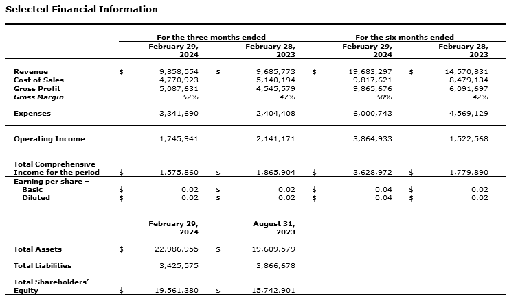 - Total comprehensive income for the three and six months ended Feb. 29, 2024, was $1,575,860 and $3,628,972, compared to total comprehensive income of $1,865,904 and $1,779,890 for the same prior year comparable periods;