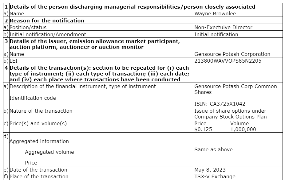 Gensource Potash Corp. has granted one million stock options to a certain director of the corporation at an exercise price of 12.5 cents and are exercisable for a period of five years. The options were granted under the corporation's stock option plan and each stock option entitles the holder to acquire one common share.
