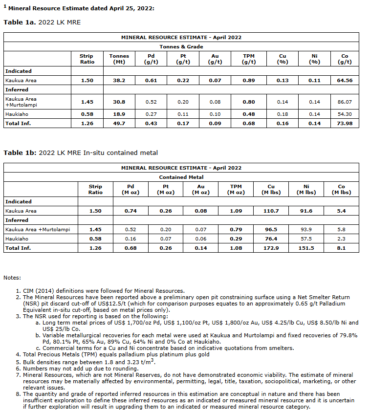 LK is the company's most advanced project having an existing National Instrument 43-101 palladium-platinum-copper-dominated open-pit resource estimate as follows: