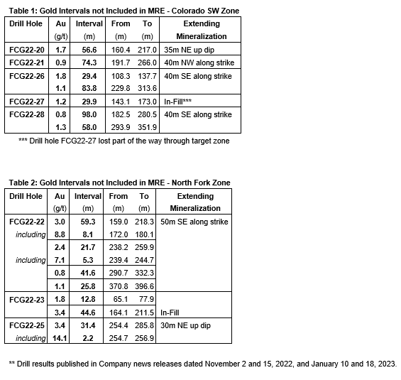 Of the 26 holes drilled by the company in the Central area of Fondaway Canyon since 2020, only 18 of those holes were incorporated into the MRE. The results of the residual eight drill holes were received after the cut-off date for results to be included into the MRE. All eight of these drill holes, FCG22-20 to FCG22-28, excluding FCG22-24 that drilled a separate target area, reported significant intervals of gold mineralization with the majority extending the gold mineralization beyond the extents delineated for the MRE.