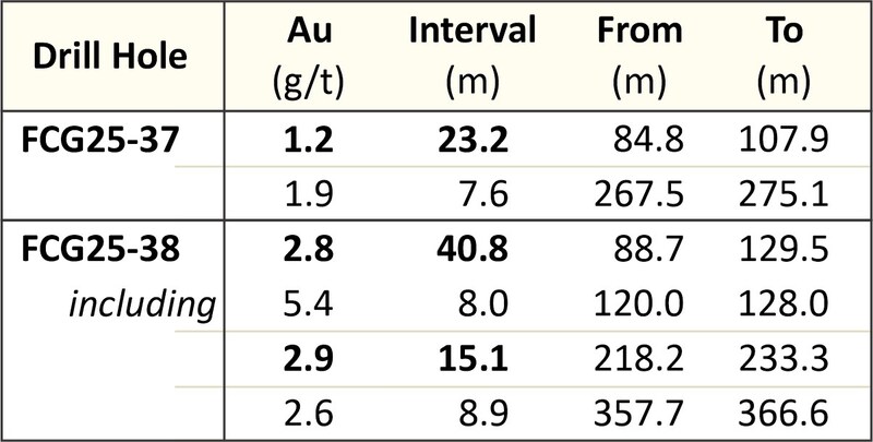 The 10-hole 2025 drill program consisted of a total 3,346 m (10,979 feet) drilled. The drill program was designed to extend the gold mineralization both along strike and dip, with the goal to expand the mineral resource, enlarge the open-pit model and significantly enhance the project's overall value. This news release marks the publishing of the final drill results from the 10 drill holes drilled in 2025, FCG25-29 through FCG25-38.