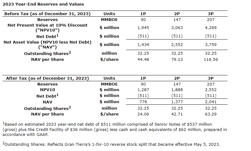 Gary Guidry, president and chief executive officer of Gran Tierra, commented: "During 2023, a combination of our strong reserves growth, ongoing reductions in debt and share buybacks allowed Gran Tierra to achieve net asset values per share** before tax of $44.48 (1P), up 288 per cent from 2020, and $79.13 (2P), up 144 per cent from 2020. With this significant growth in our net asset values per share** over the last three years, we believe Gran Tierra is well positioned to offer exceptional long-term stakeholder value.