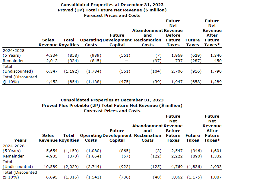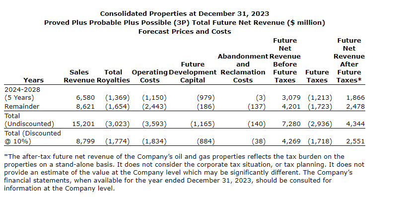 The pricing assumptions used in estimating NI 51-101 and COGEH compliant reserves data disclosed above with respect to net present values of future net revenue are set forth herein. The price forecasts are based on an average of three independent qualified reserves evaluators' commodity price forecasts at Jan. 1, 2024 (McDaniel, Sproule and GLJ). All three of these companies are independent qualified reserves evaluators and auditors pursuant to NI 51-101.
