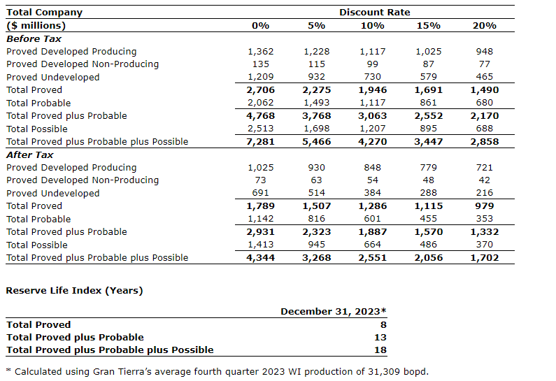 Gran Tierra Energy Inc. has released the company's 2023 year-end reserves as evaluated by the company's independent qualified reserves evaluator McDaniel & Associates Consultants Ltd. in a report with an effective date of Dec. 31, 2023 (the GTE McDaniel reserves report).
