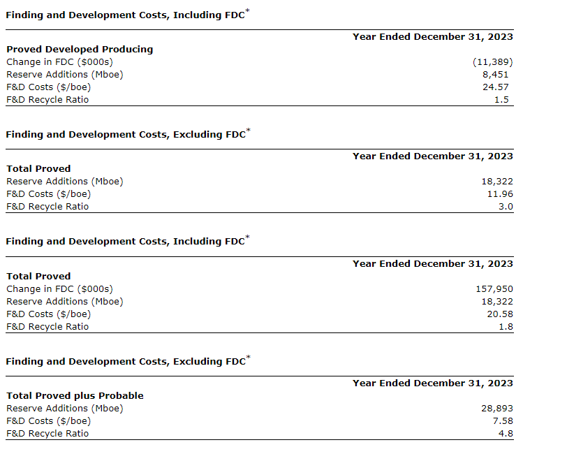 - Finding and development costs (F&D), including change in future development costs (FDC), on a per boe basis of $20.58 (1P), $16.09 (2P) and $14.67 (3P).