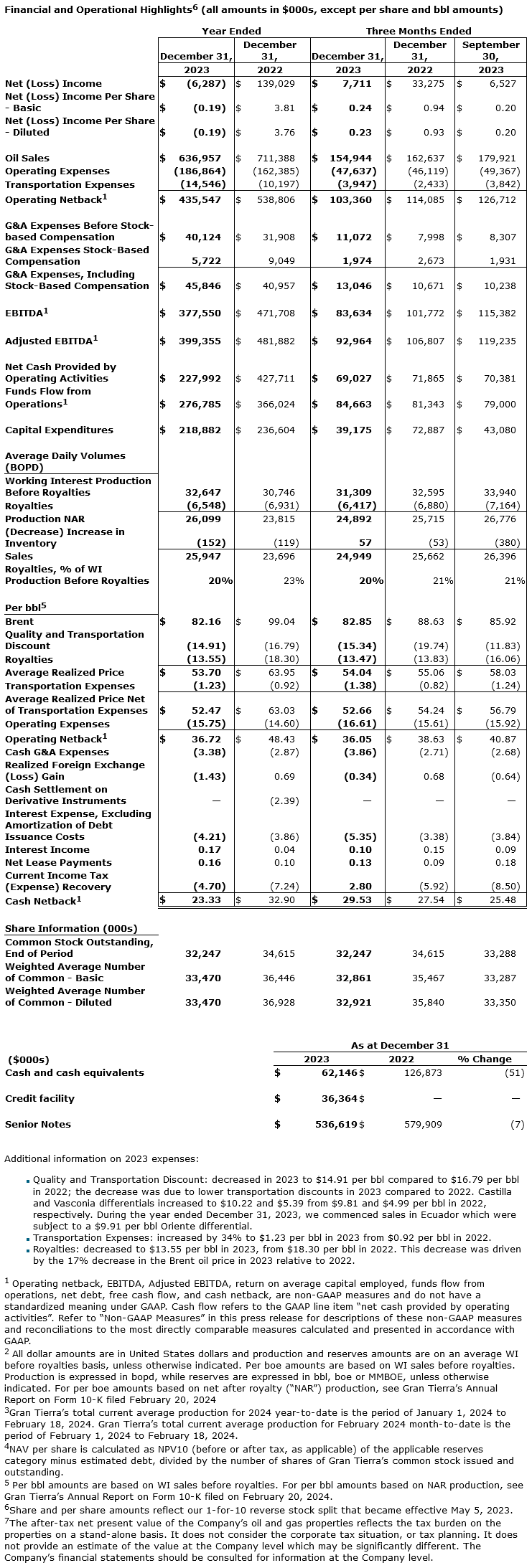 GRAN TIERRA ENERGY INC. ANNOUNCES 2023 FOURTH QUARTER & YEAR-END RESULTS, INCLUDING SUCCESSFULLY MEETING 2023 GUIDANCE FOR ANNUAL PRODUCTION, FUNDS FLOW FROM OPERATIONS1 AND FREE CASH FLOW1