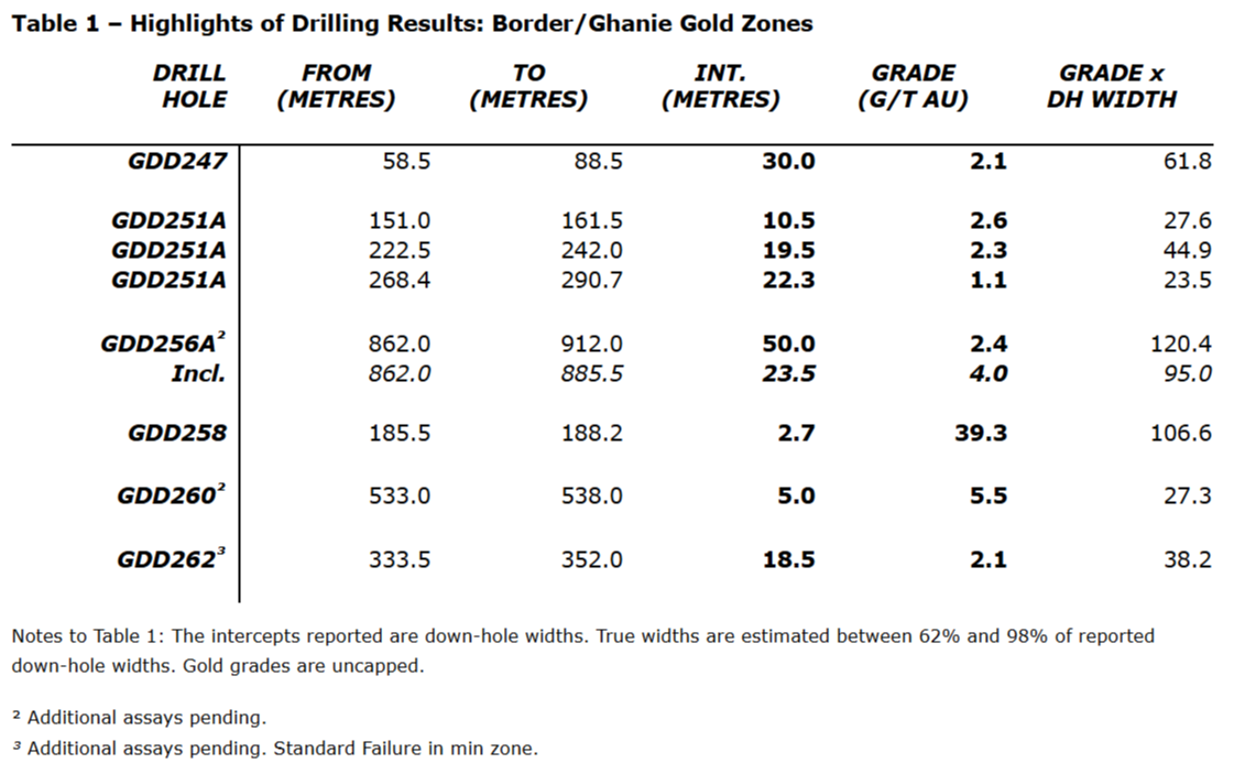 All of the drill holes, with the exception of hole GDD256A, targeted the Border zone area located south of the Ghanie open-pit shell, as defined in the PEA. The program successfully intercepted near-surface gold mineralization in hole GDD247, which returned 30.0 m at 2.1 grams per tonne gold from 58.5 m downhole, as well as deeper gold mineralization encountered in hole GDD260, which assayed 5.5 g/t Au over 5.0 m from 533 m downhole. Multiple gold intercepts occurred in several of the drill holes at more moderate depths, with hole GDD251A returning 10.5 m at 2.6 g/t Au, 19.5 m at 2.3 g/t Au and 22.3 m at 1.1 g/t Au. Exceptionally high-grade gold was intercepted in hole GDD258, which returned 39.3 g/t Au over 2.7 m.