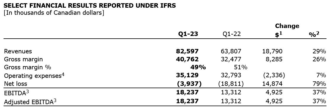 Adjusted EBITDA: For the quarter ended March 31, 2023, adjusted EBITDA was $18,237, an increased of $4,925, or 37 per cent. The decrease in adjusted EBITDA is driven by an increase in gross margin of $8,285, offset by an increase in operating expenses.