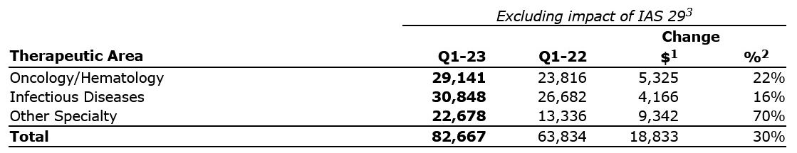 Revenues: For the quarter ended March 31, 2023, revenues, excluding the impact of IAS 29, was $82,667 an increase of $18,833 or 30 per cent compared to the same prior year period. The revenues by therapeutic areas are as follows: