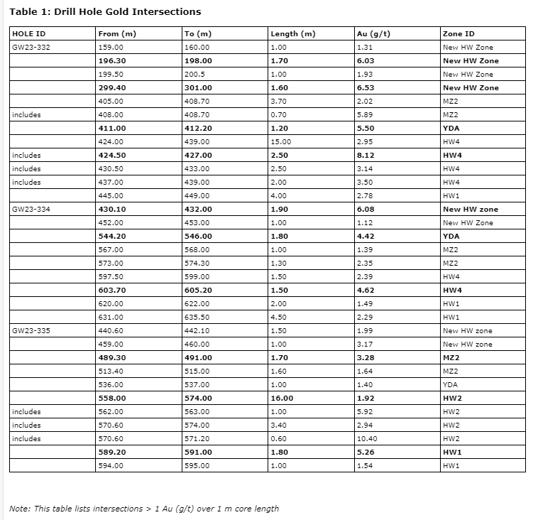 Ten significant gold intersections were encountered in three recent holes: GW23-332, GW23-334 and GW23-335. The highest intersection received was 8.12 g/t Au over 2.5 m in hole GW23-332 from the HW4 zone. Encouragingly, several new hangingwall zones were encountered in the holes with the highest being 6.53 g/t Au over 1.6 m, 6.08 g/t Au over 1.9 m and 6.03 g/t Au over 1.7 m. Two holes also intersected the HW4 zone, returning 2.95 g/t Au over 15 m, including 8.12 g/t Au over 2.5 m (GW23-332) and 4.62 g/t Au over 1.5 m (GW23-334). Other significant zones encountered were the YDA zone in hole GW23-332, which returned 5.5 g/t Au over 1.4 m, the HW1 zone in hole GW23-335, which returned 5.26 g/t Au over 1.8 m, and the HW2 zone in hole GW23-334, which returned 4.42 g/t Au over 1.80 m.