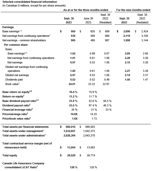 GREAT-WEST LIFECO REPORTS RECORD BASE EARNINGS IN THE THIRD QUARTER OF 2023