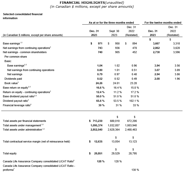 "This quarter also marks a transition of senior leadership as we welcome Jon Nielsen and Fabrice Morin as the company's incoming chief financial officer, Great-West Lifeco, and president and chief operating officer, Canada, respectively, on Feb. 16, 2024," continued Mr. Mahon. "I'd like to personally congratulate Garry MacNicholas, Jeff Macoun and Arshil Jamal on their retirements and thank them for their dedicated contributions to our company's success over their careers, which each spanned many decades."