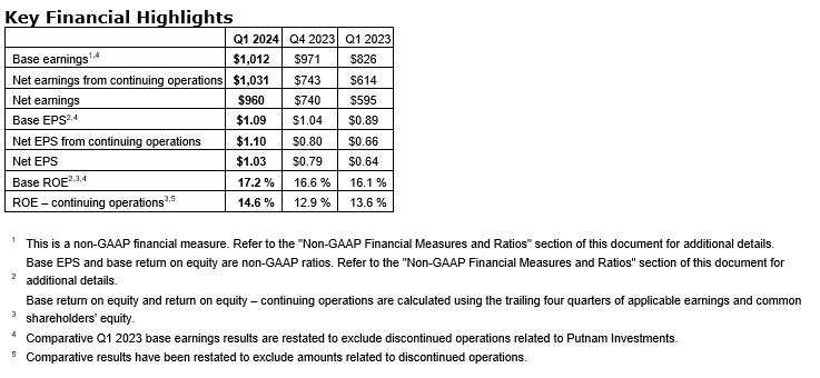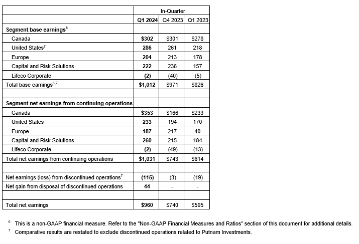 "We've had a strong start to the year, exceeding $1-billion in quarterly base earnings for the first time, building on our momentum from 2023," said Paul Mahon, president and chief executive officer, Great-West Lifeco. "This is the third consecutive quarter of record base earnings supported by the deliberate actions we've taken to reposition and strengthen our portfolio of businesses. This disciplined execution against our strategies is unlocking value today and positioning Lifeco for sustainable medium- and longer-term growth and success."