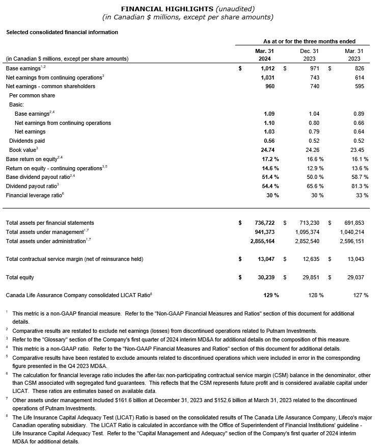 This earnings news release for Great-West Lifeco should be read in conjunction with the company's management discussion and analysis (MD&A) and consolidated financial statements for the period ended March 31, 2024, prepared in accordance with international financial reporting standards (IFRS), as issued by the International Accounting Standards Board, unless otherwise noted. These reports are available on the company's website under financial reports. Additional information relating to Great-West Lifeco is available on SEDAR+. All figures are expressed in millions of Canadian dollars, unless otherwise noted.