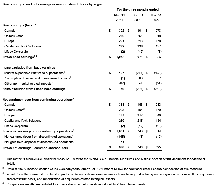 For reporting purposes, Great-West Lifeco's consolidated operating results are grouped into five reportable segments -- Canada, United States, Europe, capital and risk solutions, and Great-West Lifeco corporate -- reflecting the management and corporate structure of the company. For more information, refer to the company's first quarter 2024 interim management's discussion and analysis (MD&A).