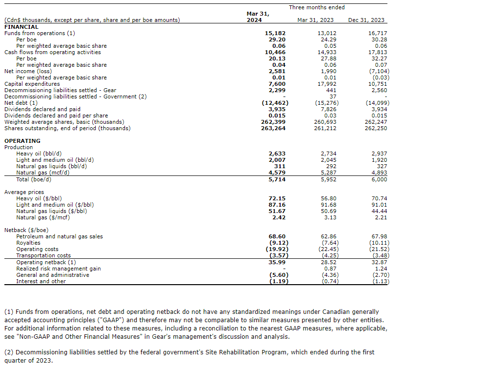 GEAR ENERGY LTD. ANNOUNCES FIRST QUARTER 2024 OPERATING RESULTS