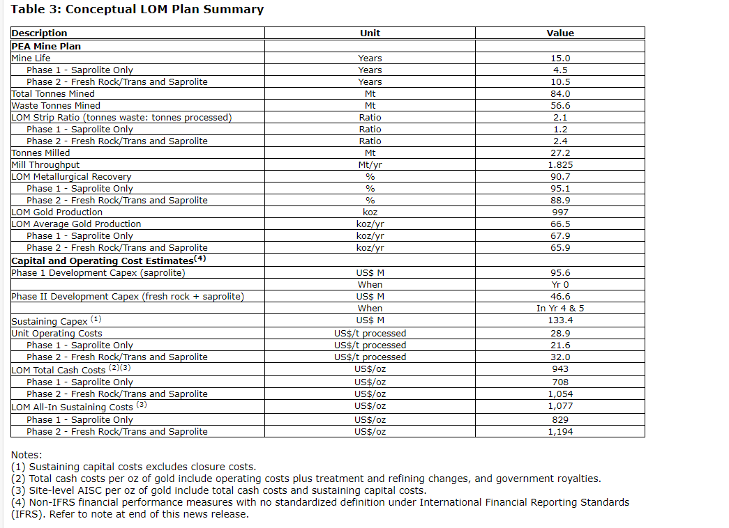 The PEA was prepared by ERM Consultants Canada Ltd. with contributions from Soutex Inc. for aspects related to metallurgy and the process plant in accordance with National Instrument 43-101 Standards of Disclosure for Mineral Projects. The PEA contemplates a fit-for-purpose, low-capital-cost-intensity phased development plan for the project. The initial phase (phase 1) comprises shallow (starting at surface), low-strip-ratio open pits targeting soft-rock saprolite resources and a processing plant design that accounts for the beneficial characteristics of saprolite. This is followed by the second phase (phase 2), the development of open-pit fresh rock resources, in which gold production is derived from a blend of fresh rock, transition rock and saprolite material.