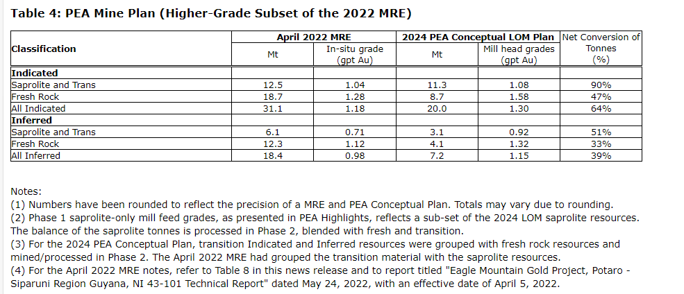 - The PEA is based on the April, 2022, mineral resource estimate (MRE) comprising an estimated 31.1 million tonnes (Mt) grading 1.18 gpt gold for 1,183,000 oz of gold in indicated mineral resources, and 18.4 Mt grading 0.98 gpt gold for 582,000 oz of gold in inferred mineral resources. The 2022 MRE is contained in a technical report titled "Eagle Mountain Gold Project, Potaro -- Siparuni Region Guyana, NI 43-101 Technical Report" dated May 24, 2022, with an effective date of April 5, 2022.
