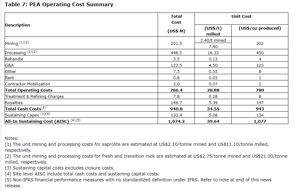 Total LOM operating costs are estimated at $786-million (U.S.). The operating cost estimate is based on the total amount of labour, materials and consumables that will be required to fully execute the mining and processing plans for phase 1 and 2. The PEA contemplates open-pit mining and power generation by contractors. Average unit mining cost of $2.10 (U.S.) and $2.75 (U.S.) per tonne mined were used for saprolite and fresh rock/transition, respectively, in the economic analysis. Operating costs have been determined based on benchmarking analyses using similar-sized saprolite and fresh rock operations with adjustments for local conditions. For unit processing cost determinations, the average ore blend (ratio of fresh rock to saprolite) for the LOM was used to estimate power draw and reagent consumptions.