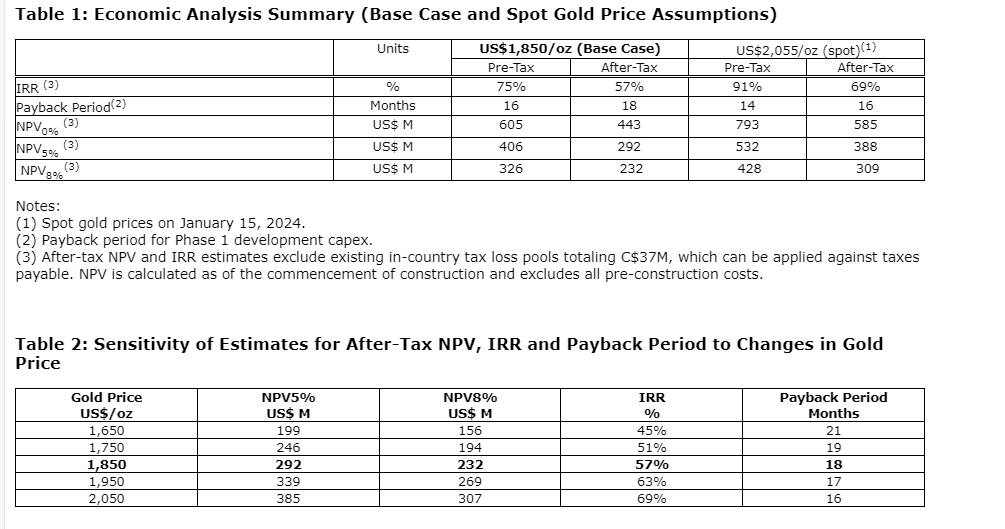 - After-tax IRR of 69 per cent and after-tax NPV (5 per cent) of $388-million (U.S.) at spot gold prices of $2,055 (U.S.) per oz (Jan. 15, 2024).
