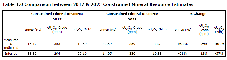 To facilitate a comparison between the 2023 and 2017 MRE, the table entitled "Comparison of 2017 unconstrained and constrained mineral resources" provides an assessment on the impact of a constraining open-pit shell based on uranium selling price of $70 (U.S.)/lb U3O8 and a 100 ppm eU3O8 cut-off grade on the 2017 MRE.