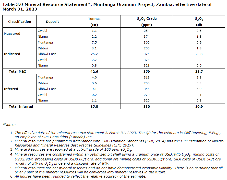 A summary of the mineral resources for all deposits comprising the Muntanga project is presented in the table entitled "Mineral resource statement, Muntanga uranium project, Zambia, effective date of March 31, 2023."