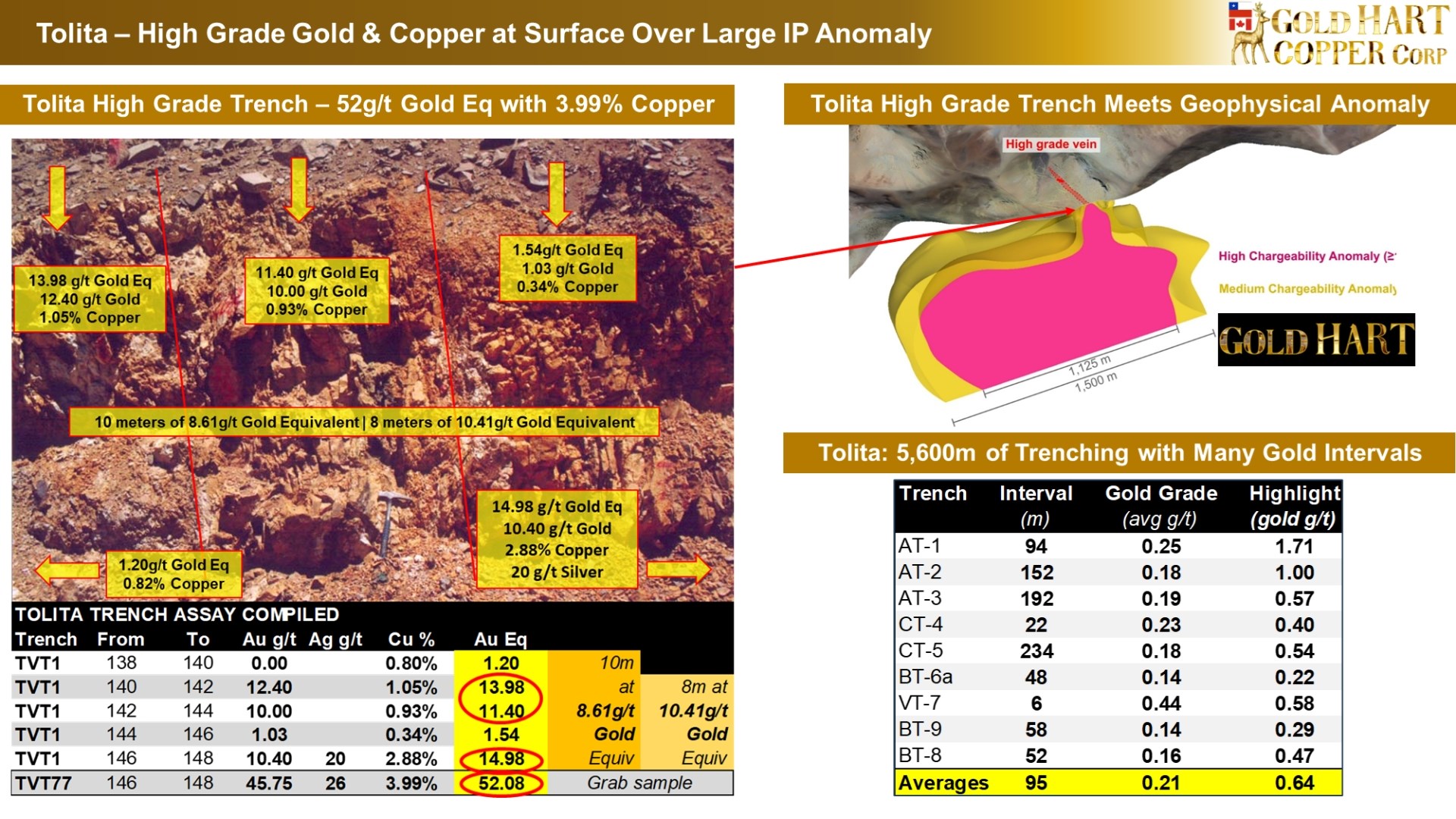 As prior announced (Jan. 22, 2026), in addition to Gold Hart's primary diamond drilling at Tolita, the Company is planning to add a reverse circulation (RC) drill rig in order to target certain higher grade opportunities closer to surface at Tolita. Specifically, Gold Hart intends to target its highest grade trench, which grades 8.61g/t gold equivalent over 10m, including 2m at 10.40g/t gold, 20g/t silver, and 2.88% copper, and including grabs of 45.75g/t gold, 28g/t silver, and 3.99% copper (approximately 52g/t gold equivalent).