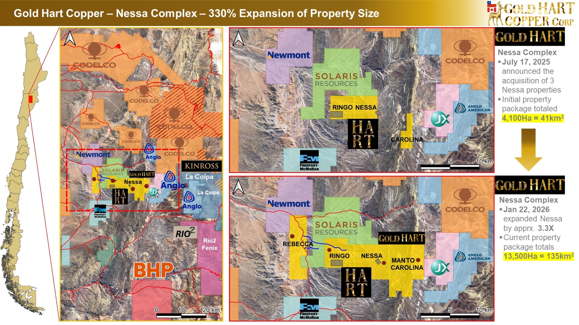 Gold Hart Copper recently (Jan. 22, 2026) announced a significant expansion of the Nessa gold copper silver complex by approximately 3.3X from an initial property size of 4,100Ha up to a current land position of 13,500Ha (135km2). As prior disclosed, Gold Hart completed a follow-on geochemical survey at Nessa to test certain areas of interest.