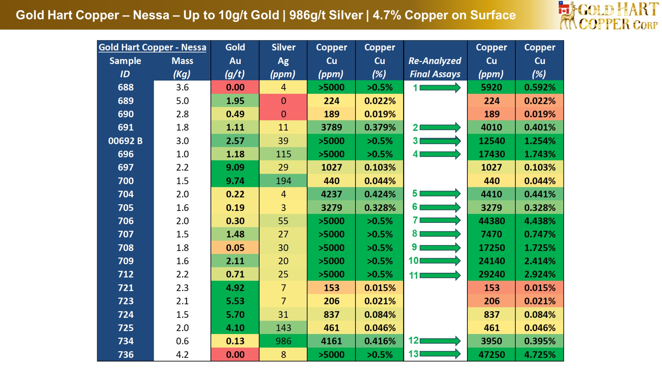 Gold Hart is also pleased to announce that the Company has received the re-analyzed lab assays from the geochemical survey at its Nessa Complex just west of Kinross' La Coipa Gold Mine. In total, 13 samples were re-analyzed, with 12 returning higher grades than prior announced. Specifically, 7 samples graded 1.25% to 4.73% copper, including 4 samples exceeding 2.40% copper.