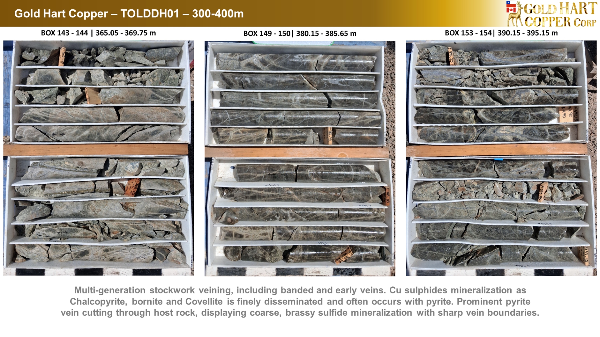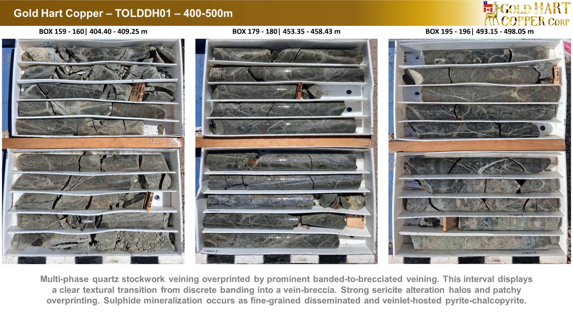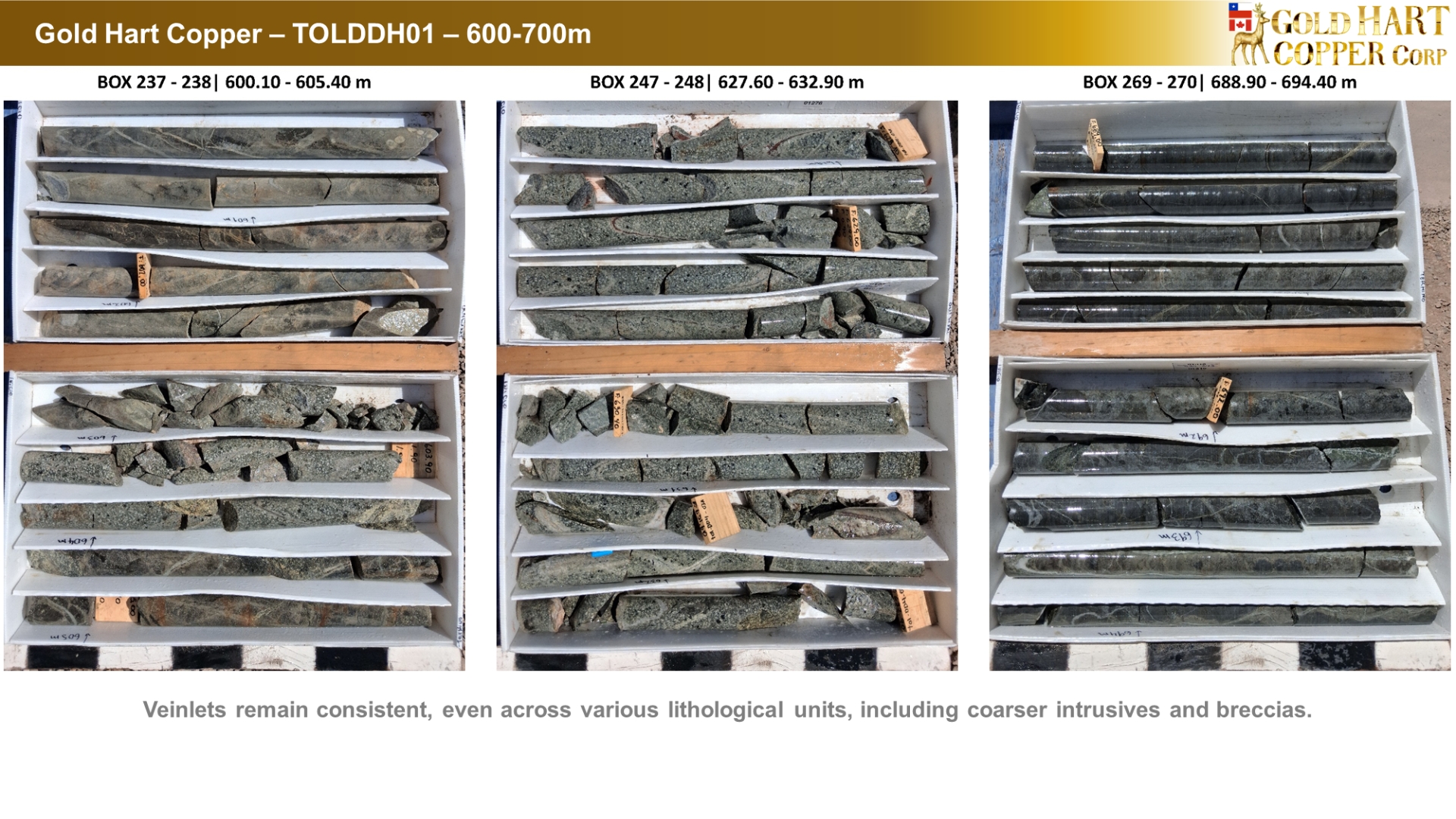 On February 23, 2026, Gold Hart announced completion of the drill hole DDHTOL01, which reached a depth of approximately 1,053m. Interestingly, the core continued to display encouraging characteristics, with multiple intervals showing strong hydrothermal alterations and mineralization consistent with a fertile porphyry-style environment. Gold Hart geologists observed multiple generations of veinlets and stockworks with varying intensities over intervals up to several hundred meters, banded veinlets with thicknesses of several cm, and locally chalcopyrite and bornite mineralization has been recognized in several of these veinlets. HART geologists do not believe the drill intercepted the same fault which caused a sterile zone in the middle of the initial 2 diamond holes.