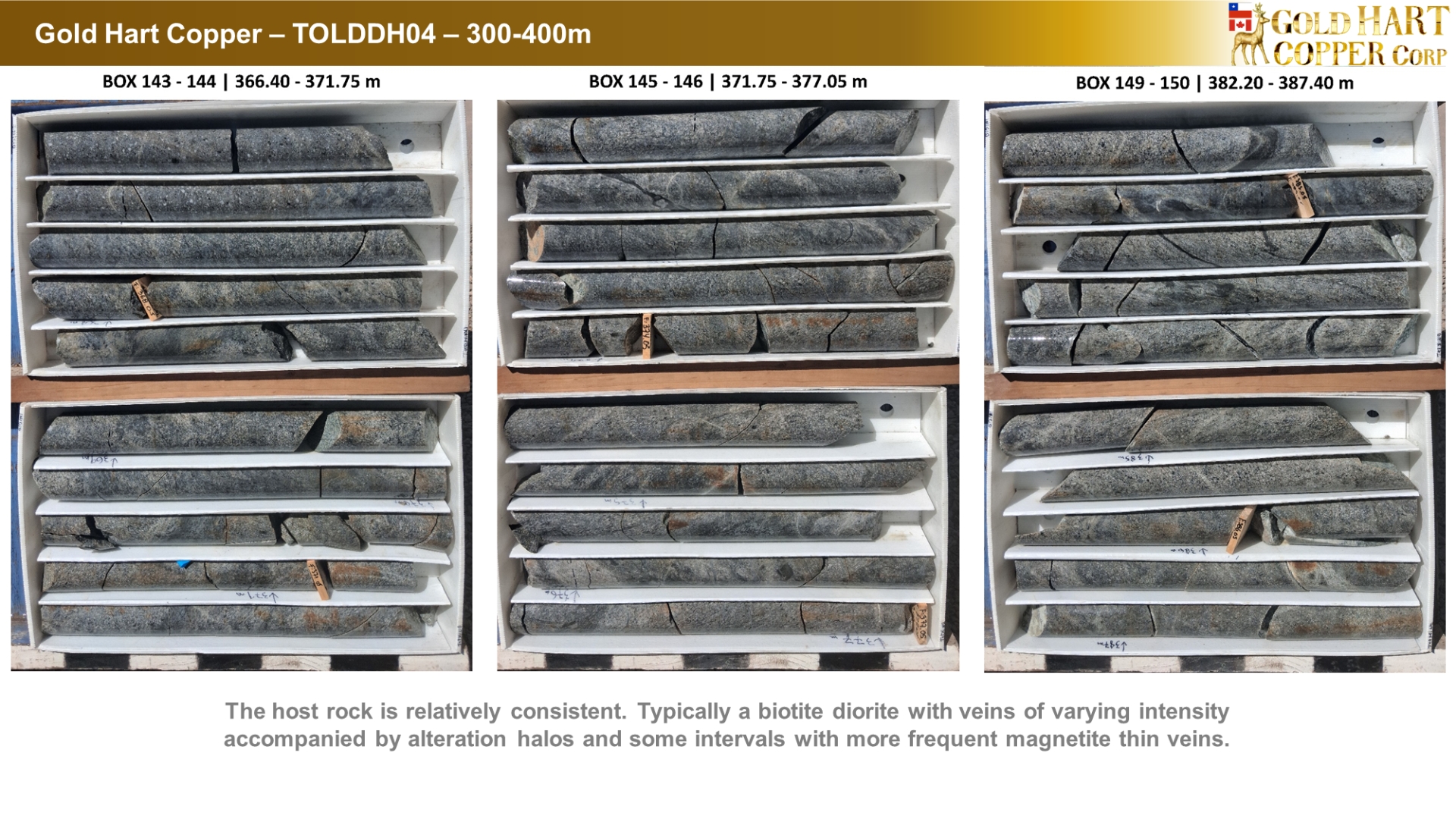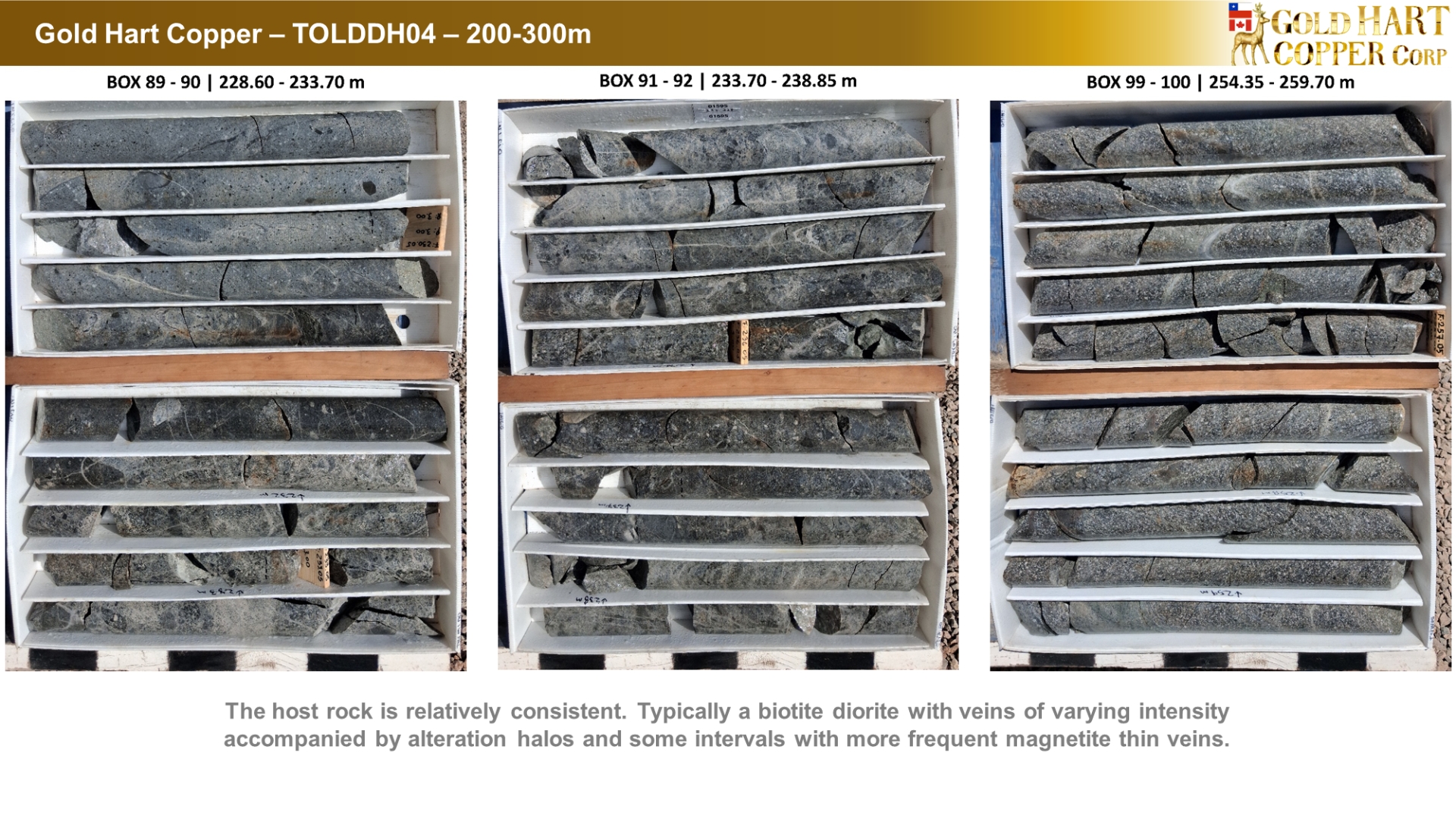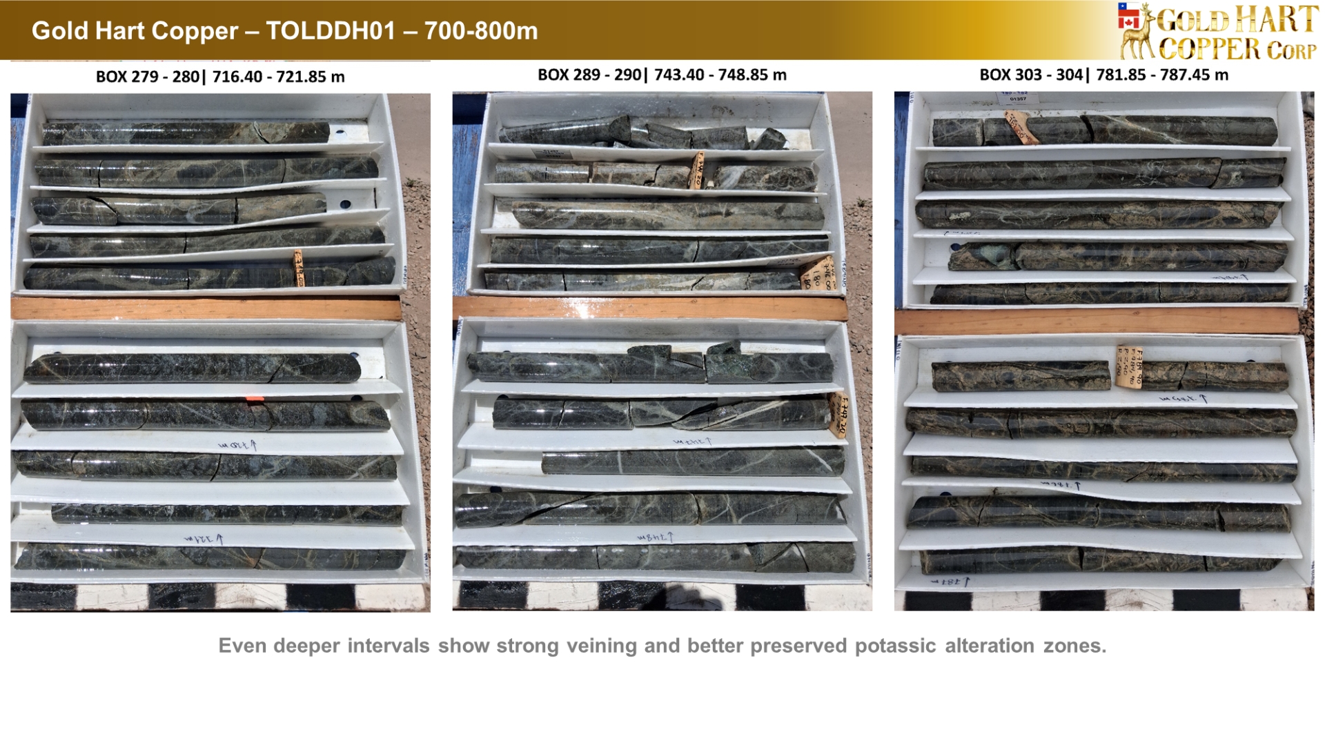 On February 23, 2026, Gold Hart announced completion of the drill hole DDHTOL01, which reached a depth of approximately 1,053m. Interestingly, the core continued to display encouraging characteristics, with multiple intervals showing strong hydrothermal alterations and mineralization consistent with a fertile porphyry-style environment. Gold Hart geologists observed multiple generations of veinlets and stockworks with varying intensities over intervals up to several hundred meters, banded veinlets with thicknesses of several cm, and locally chalcopyrite and bornite mineralization has been recognized in several of these veinlets. HART geologists do not believe the drill intercepted the same fault which caused a sterile zone in the middle of the initial 2 diamond holes.