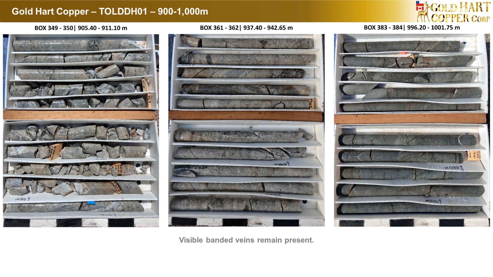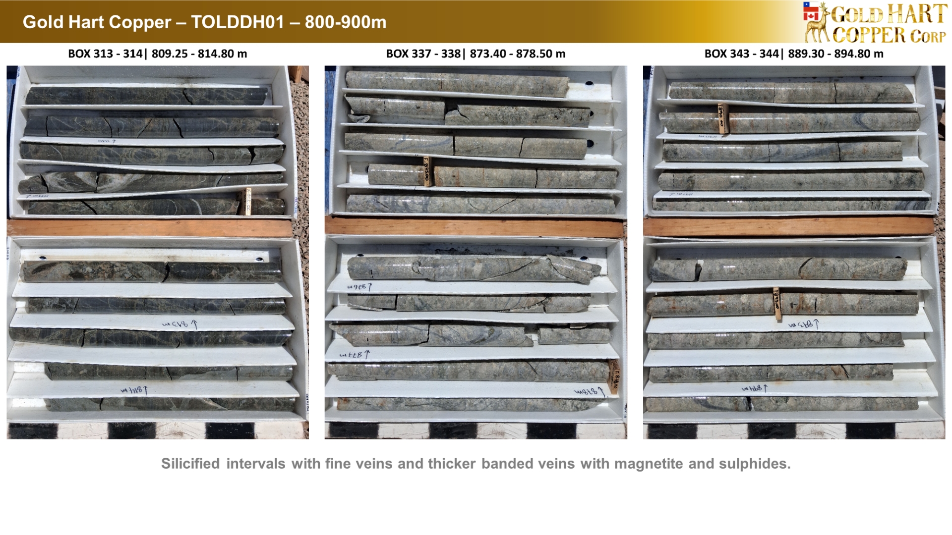 The TOLDDH01 hole was completed to a final depth of 1,051m. Drilling was halted when the rig began to slow and showed signs of mechanical strain. Although the core continued to display strong veining and remained geologically compelling, Gold Hart geologists made the strategic decision to end the hole to preserve rig integrity and ensure sufficient time to complete an additional hole before the end of the season. The Company cautions that drill core visuals may not be reliable indicators of mineralization and are therefore not to be relied upon in any meaningful way.