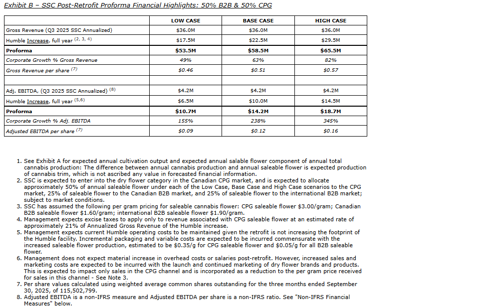 SSC has taken steps to expand its markets in anticipation of incremental retrofit production. Post retrofit, SSC will continue to service the B2B market domestically and internationally, and it expects to also participate in the recreational cannabis market on a CPG basis with its own brands. Assuming a sales mix of 50-per-cent B2B and 50-per-cent CPG, annualized financial projections by case are shown in the attached table.