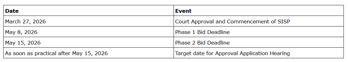 The SISP is expected to be concluded by May 15, 2026, with the approval application hearing expected to be undertaken in relatively short order thereafter.