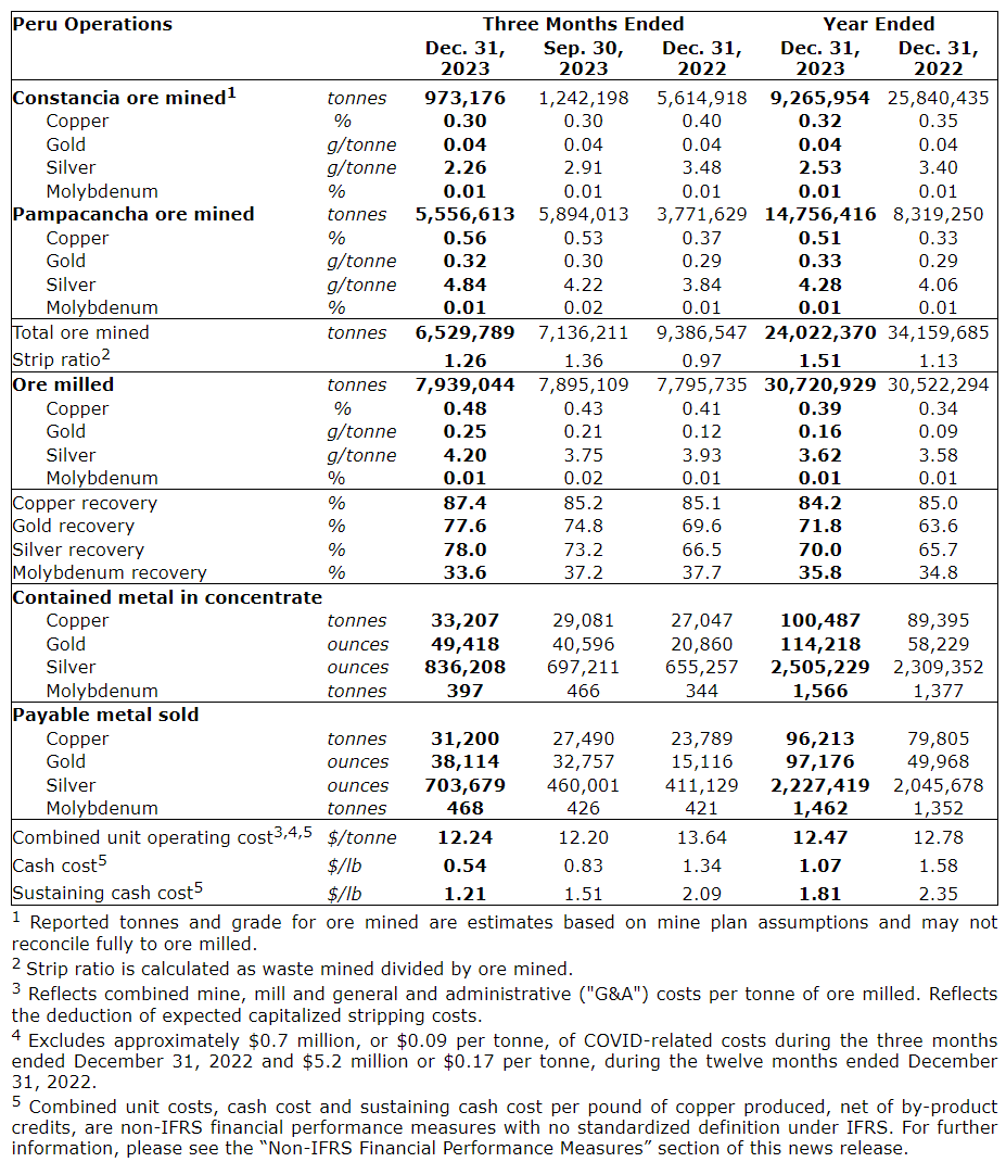 - Peru operations benefited from continued higher grades at the Pampacancha satellite pit, resulting in 33,207 tonnes of copper production and 49,418 ounces of gold production in the fourth quarter. Full-year copper production was within 2023 guidance ranges while gold production exceeded the top end of guidance. Peru cash cost per pound of copper produced, net of byproduct credits, in the fourth quarter improved to 54 cents, and full-year cash costs significantly improved over 2022 levels and achieved the low end of the 2023 annual cost guidance range.
