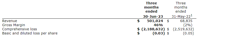 For the three months ended June 30, 2023, the company's revenue in the quarter was $501,024, an increase of 628 per cent compared with $68,835 in the three months ended May 31, 2022. Operating expenses increased from $1,302,852 in the comparable period to $2,425,896 (an increase of 86 per cent) for the three months ended June 30, 2023. This increase is largely attributable to general and administrative expenses in connection with non-cash share-based compensation expenses and non-recurring expenses. The lower operating expenses during the comparable period for the three months ended May 31, 2022, are attributable to the company's early stages of business, which resulted in lower direct and variable costs during the period.