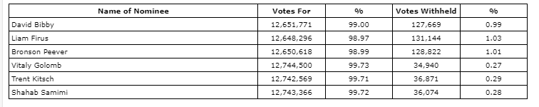 The motion with respect to the appointment of the company's auditor, Crowe MacKay LLP, was approved by a majority of votes. A total of 12,742,594 (99.71 per cent) votes were cast in favour, with 36,846 (0.29 per cent) votes withheld.