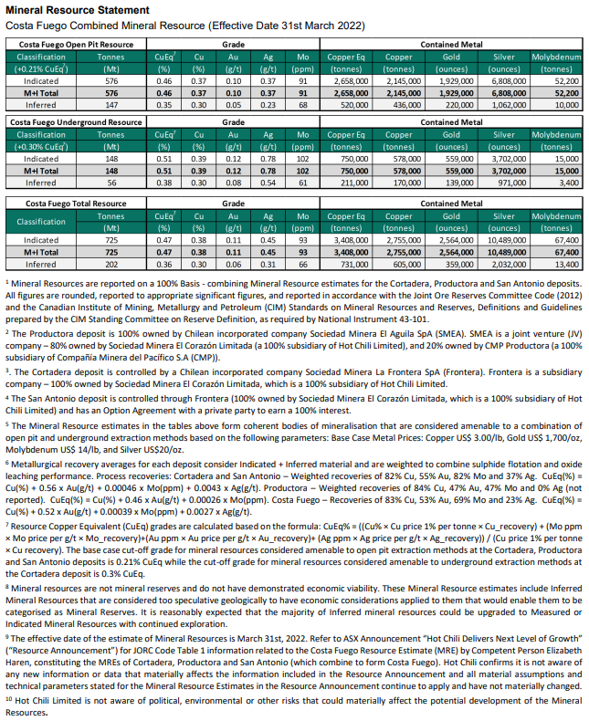 • Additional payment $2-million (U.S.), if an independently estimated JORC-compliant mineral resource is reported by Hot Chili or its subsidiaries containing 200 million tonnes or greater within the El Fuego landholdings, within a period that expires Jan. 1, 2030. Such mineral resource shall be reported at or above Hot Chili's current mineral resource reporting cut-off grade (above 0.21 per cent copper equivalent (CuEq) for open pit and over 0.3 per cent CuEq for underground).
