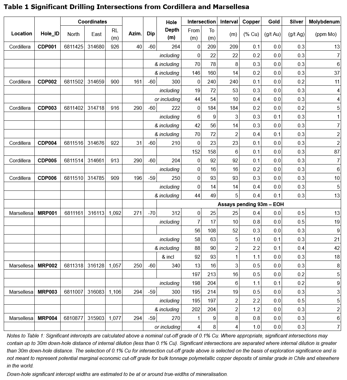 A total of 6 RC drill holes for 1,450m were completed across the historical Cordillera copper mine footprint, located approximately 1km west of Marsellesa (refer to Figure 6). Significant intersections recorded, include:
