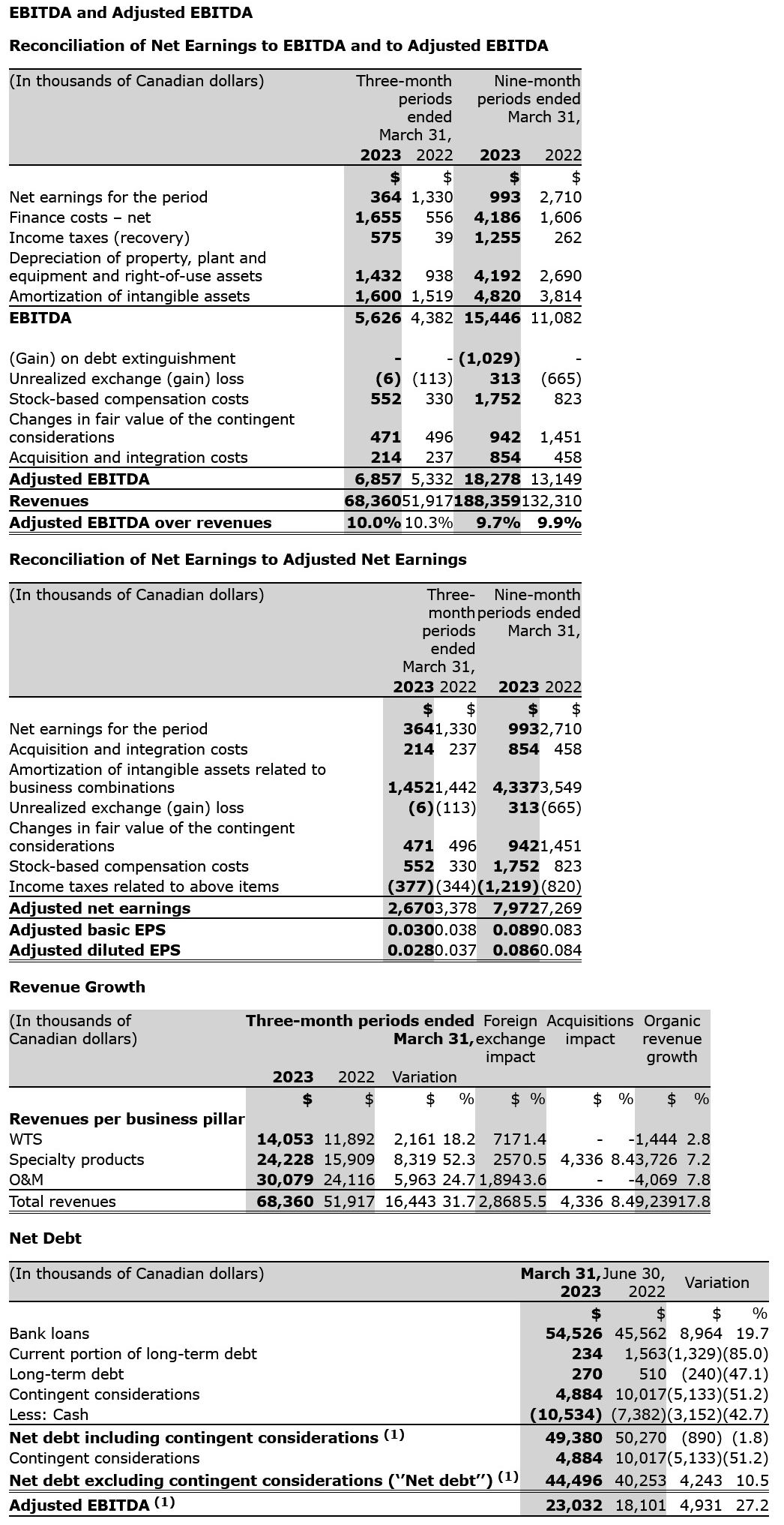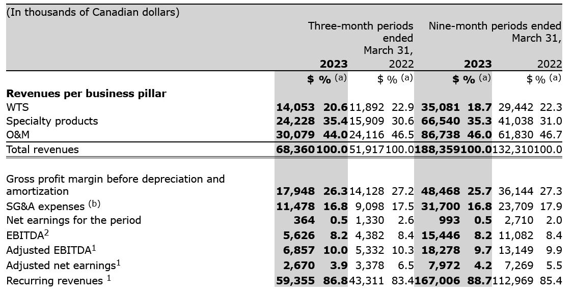 With three strong and complementary business pillars, the Corporation is well balanced and not dependent on a single source of revenue, enabling it to generate a sustained revenue growth for the three-month period ended March 31, 2023. Consolidated revenues coming from the Corporation's three business pillars, for the third quarter ended March 31, 2023, increased by $16.4 M, or 31.7%, to reach $68.4 M compared to $51.9 M in the corresponding period of previous year. This increase mainly came from an organic revenue growth of $9.2 M, or 17.8%, and an acquisition growth of $4.3 M, or 8.4% following the acquisition of Leader Evaporator ("Leader") on June 30, 2022, combined with a favorable exchange rate impact of $2.8 M, or 5.5%.