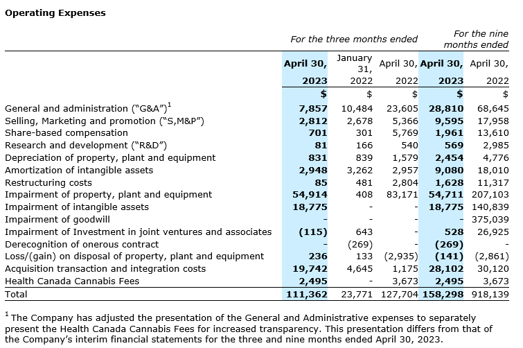 Total operating expenses in Q3 2023 increased by $87,591 from Q2 2023. The increase was driven by an impairment charge to the company's only significant CGU, the Canadian operations CGU. Due to the presence of certain indicators of impairment at April 30, 2023, the company performed a quantitative assessment and concluded the CGU was impaired by $73,689. As the result of this exercise, the company allocated the CGUs impairment on a weighted average basis between plant, property and equipment, and intangible assets, amounting to $54,914 and $18,775, respectively. Also in the period, an increase in acquisition and transaction fees was recognized due to certain consideration paid to execute the waiver and amendment agreement with Tilray, as well as the accrual of Health Canada cannabis fees, which are recognized in the third quarter of every fiscal year.