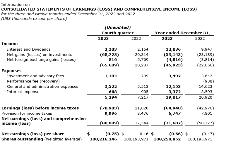 Book value per share for the quarter was $4.39, compared with $5.11 in the third quarter of 2023 and $5.03 in the fourth quarter of 2022. Net loss for the quarter was $80.9-million, compared with a net loss of $1.8-million in the third quarter of 2023 and net earnings of $17.5-million in the fourth quarter of 2022. The decrease in book value compared with that of the third quarter and the net loss in the fourth quarter were due to unrealized losses from the company's investment in TopCo LP, which was driven by lower cash flow expectations. These unrealized losses were offset by unrealized gains related to the Helios managed investments, which increased by 7.9 per cent, as well as interest and dividend income;