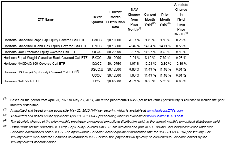 Horizons ETFs Management (Canada) Inc. has declared distribution amounts per security for its suite of covered call exchange-traded funds, for the period ending May 31, 2023, as indicated in the attached table.