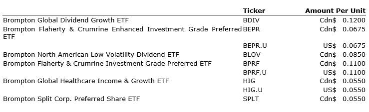 Brompton Funds has declared monthly distributions for record dates from July to September, 2025, for each of the following exchange-traded funds.
