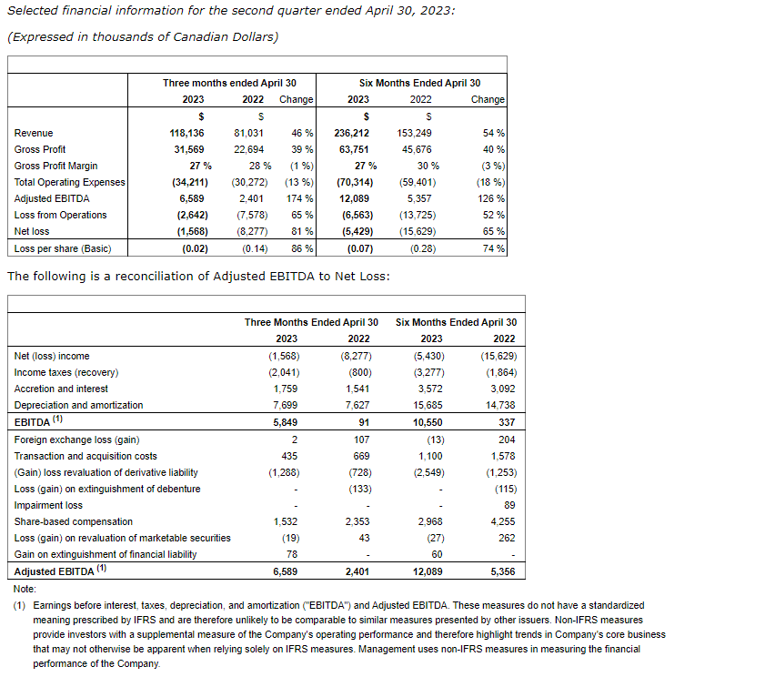 - Adjusted EBITDA (earnings before interest, taxes, depreciation and amortization) increased to $6.6-million in the second fiscal quarter of 2023 compared with $2.4-million during the same period in 2022, representing increases of 174 per cent year over year and 20 per cent sequentially.