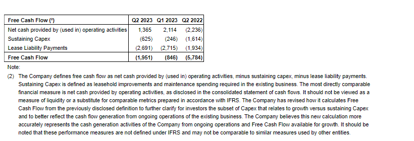 - Free cash flow was ($2.0)-million in the second fiscal quarter of 2023 compared with ($800,000) in the first fiscal quarter of 2023. Importantly, this includes a meaningful reduction of $6.8-million in accounts payable and accrued liabilities during the second fiscal quarter. Free cash flow also represented a 66-per-cent improvement versus ($5.8)-million in the second fiscal quarter of 2022.