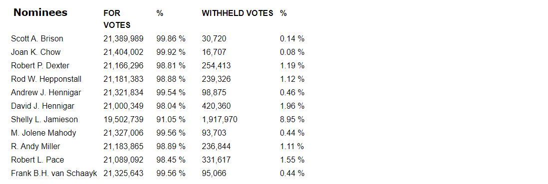 The 11 nominees set forth in the circular were elected as directors of the company to hold office until the next annual meeting, or until their respective successors are elected or appointed. Detailed results of the vote for the election of directors are set out in an attached table.