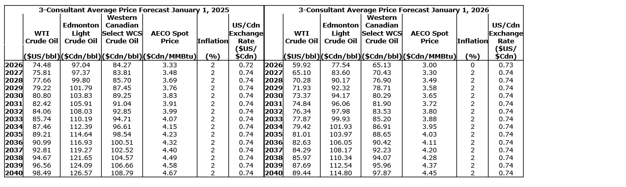 With volatile oil markets in 2025 contributing to significant shifts in commodity outlooks, the Jan. 1, 2026, three-consultant average price forecast reflects materially lower WCS (Western Canadian Select) pricing -- down approximately 23 per cent in 2026, 16 per cent in 2027 and 10 per cent over the subsequent 15-year period from the prior year. The 2026 three-consultant average price forecast uses a five-year 2026-to-2030 WTI (West Texas Intermediate) price of $68.12 (U.S.) per barrel (bbl) and WCS price of $74.29 (Canadian) per bbl.